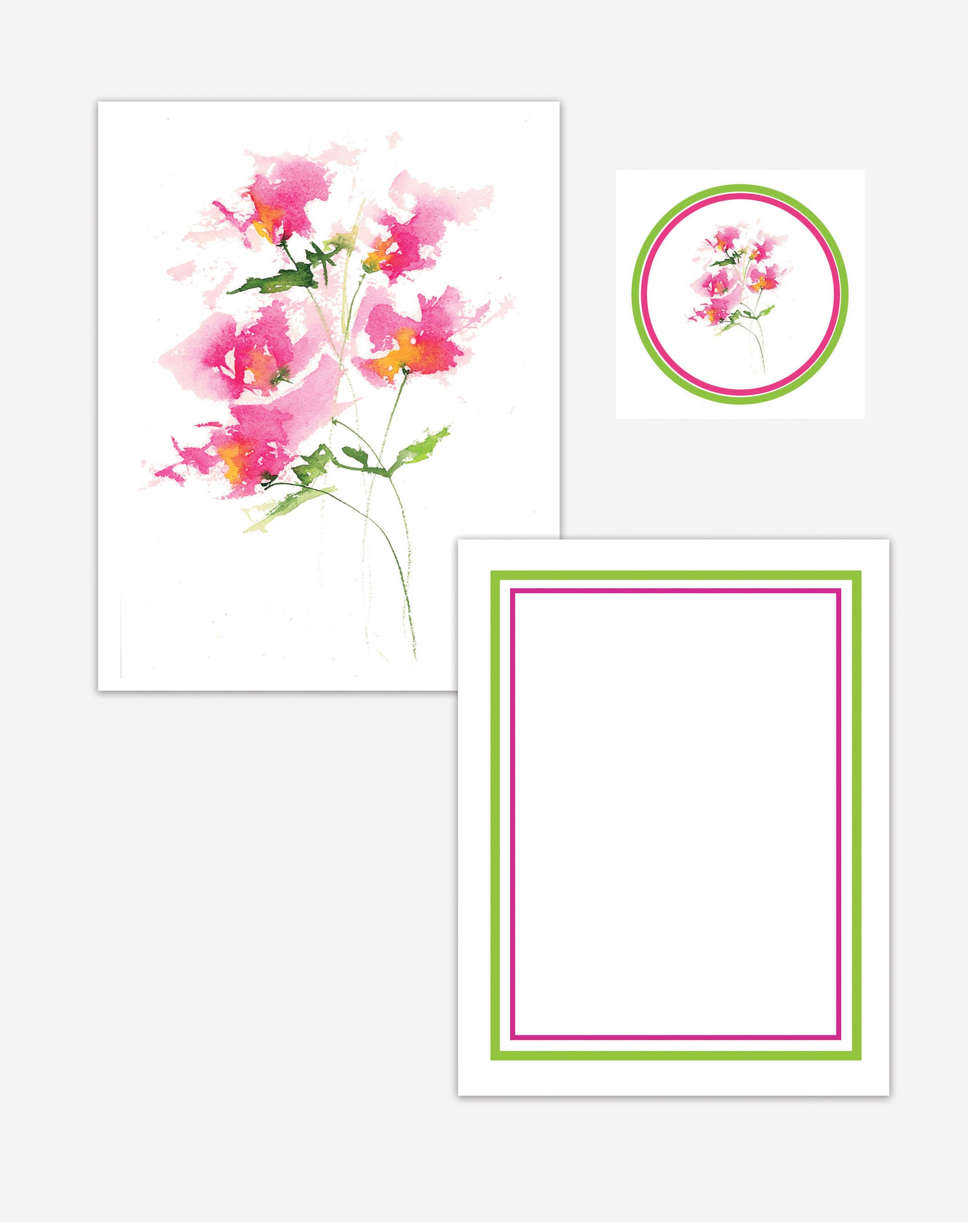 Tara watercolor floral painting on back of the card and green and pink color border on the front, with plenty of room for your personal note. A coordinating floral sticker to seal the white envelope of your cards included. Card details: